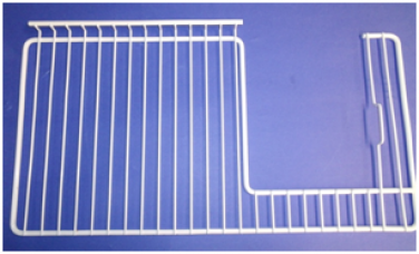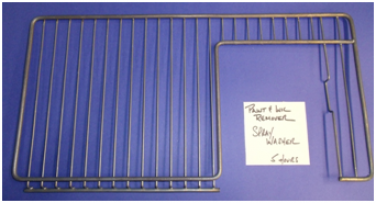 Lightly brushed with a nylon bristle brush, especially where the wire bars join the framework of the wire rack, during the fresh water rinse followed by air pressure drying.