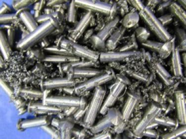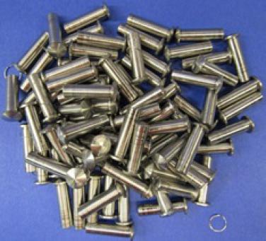 an assortment of stainless steel pins, steel plugs and two plastic bins